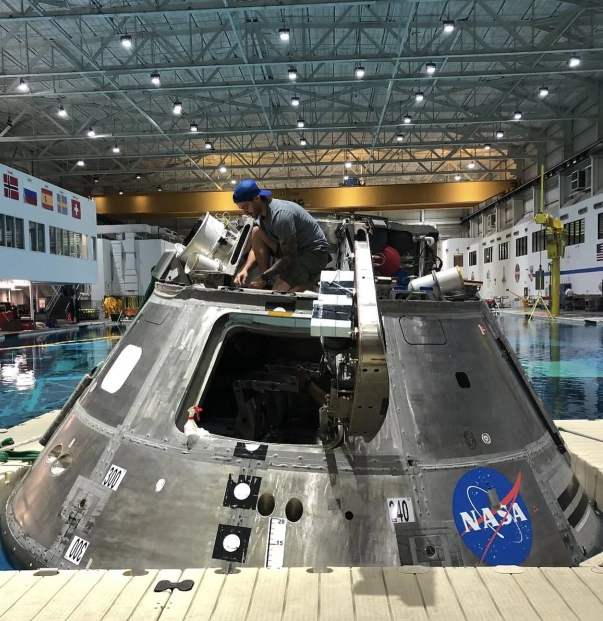Romero and the team would mimic environments and potential incidents that a capsule returning to earth could encounter while landing in water. The main part of his work was procedure development, which was done through multiple scenario repetitions at NASA’s 6.2 million-gallon pool. They used wave machines to stimulate wave lengths, shut off all the lights, turn the sprinklers in a rain simulation and turn on high powered fans. For distress, team would tip the capsule mock-up on its side or upside down.